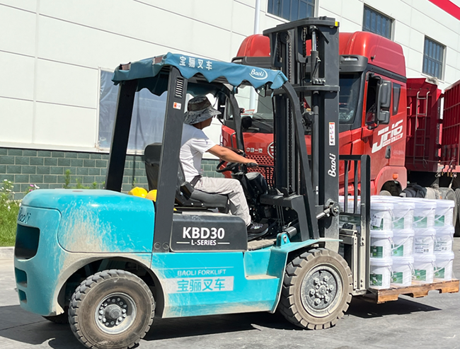 我们目睹到在室外繁忙搬运防水材料的宝骊燃油叉车和在室内转运的电动叉车。一目了然,燃油叉车主要在室外搬运,产生的噪音和卷起的尘土不会进入室内。电动叉车主要在室内狭小空间搬运。
