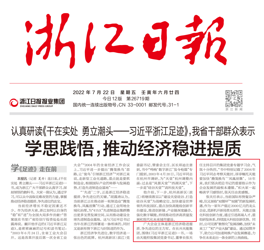 《浙江日报》报道张天任董事长学思践悟