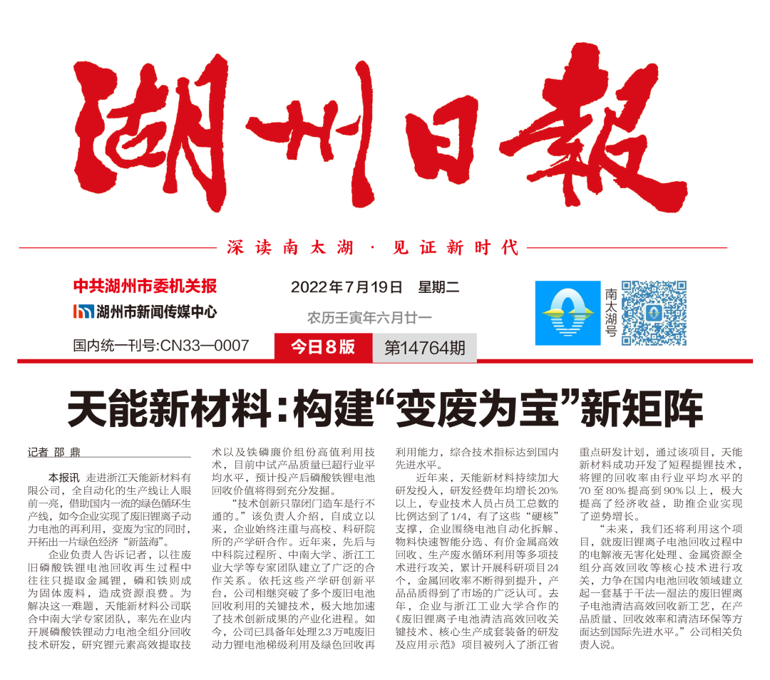 7月19日,《湖州日报》发表《天能新材料:构建“变废为宝”新矩阵》一文,报道了浙江天能新材料有限公司实现废旧锂离子动力电池的再利用,变废为宝的同时,开拓出一片绿色经济“新蓝海”。