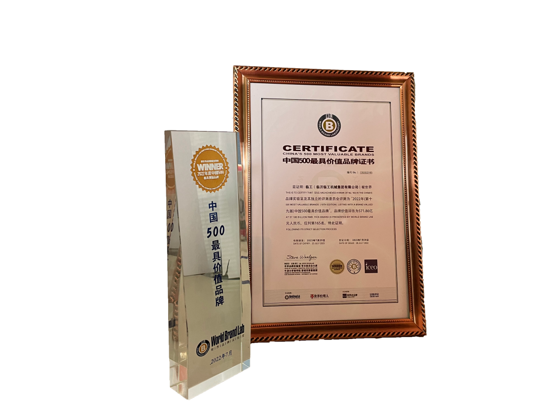 2022年7月26日,由世界品牌实验室主办的第十九届“世界品牌大会”在北京举行,会上发布了2022年《中国500最具价值品牌》排行榜,临工集团以571.86亿元品牌价值位列165位,连续9年登榜,品牌价值连年攀升。