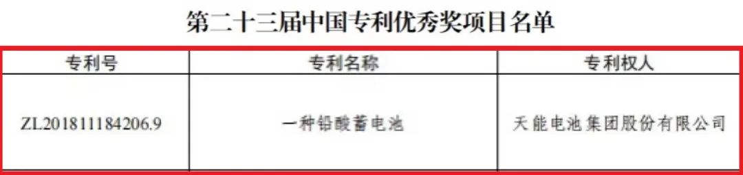 近日,国家知识产权局发布第二十三届中国专利优秀奖项目名单,天能发明专利《一种铅酸蓄电池》榜上有名。截至目前,天能共获得10项中国专利奖。