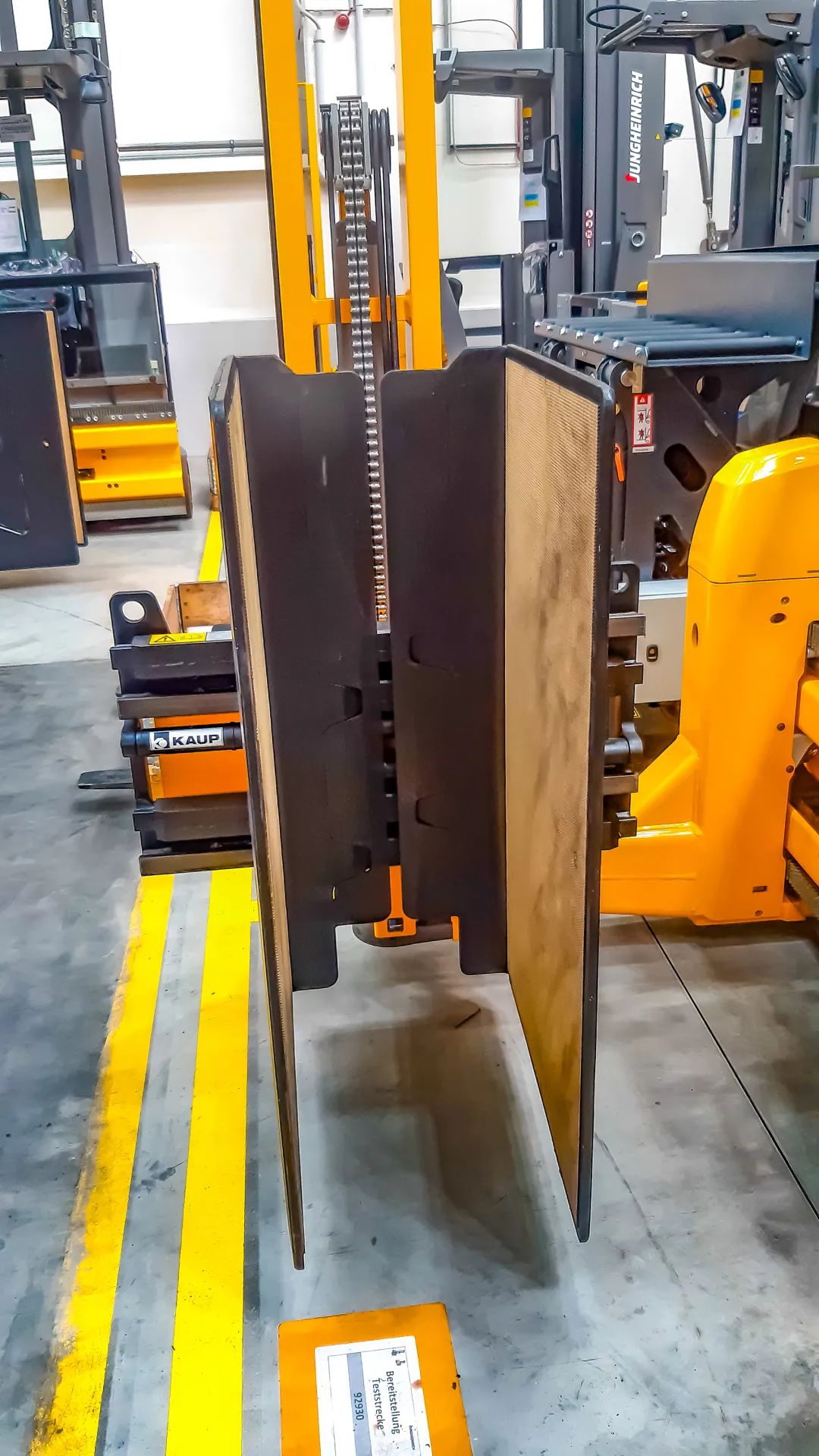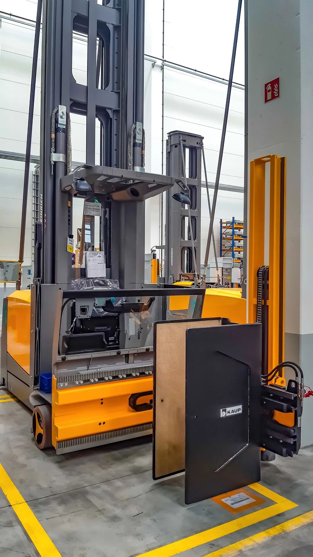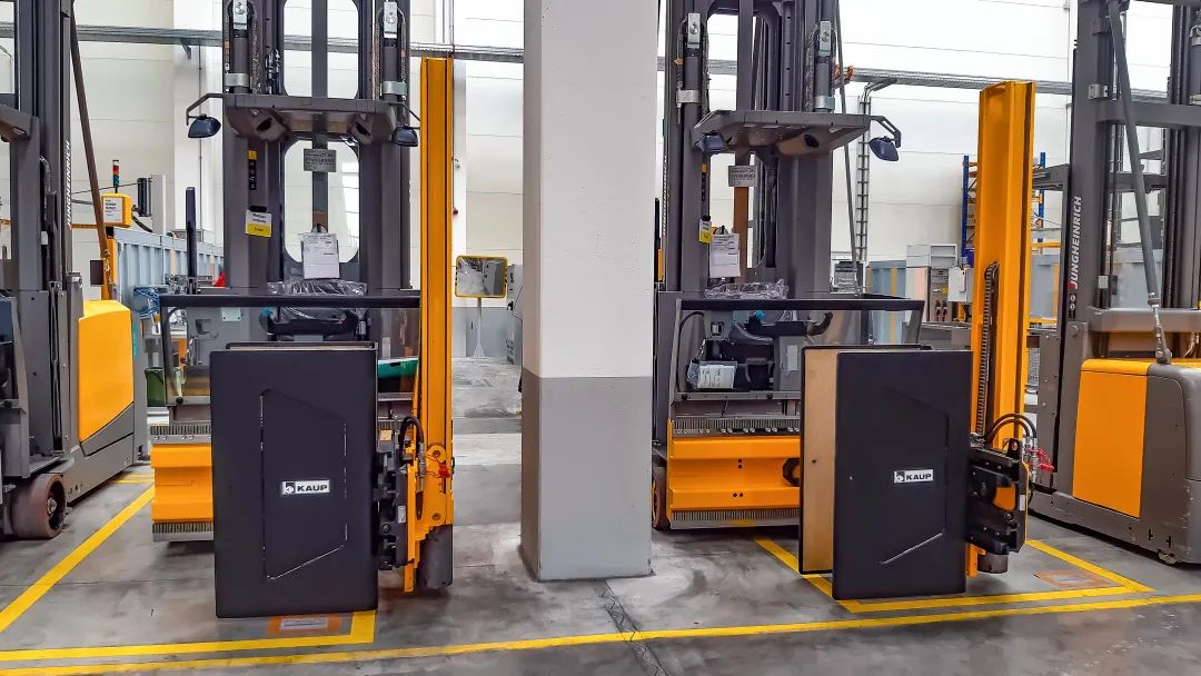 Here, several VNA has been equipped with Appliance Clamps from KAUP. Once more, this use case proves that KAUP can adapt its attachments to different kinds of industrial trucks.