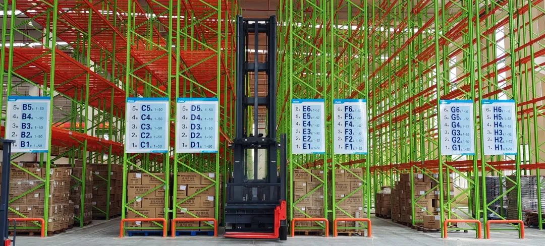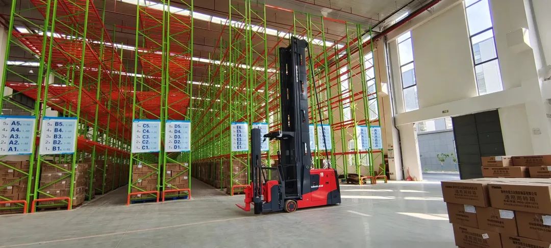 该客户企业使用MiMA人上型三向堆垛车后,有效的提高了仓库的库容量。相比传统平衡重车型,同样的仓储面积,托盘位数可增加200%,货架高度可增加100%,通道宽度可减少55%,整体库容量提升200%!