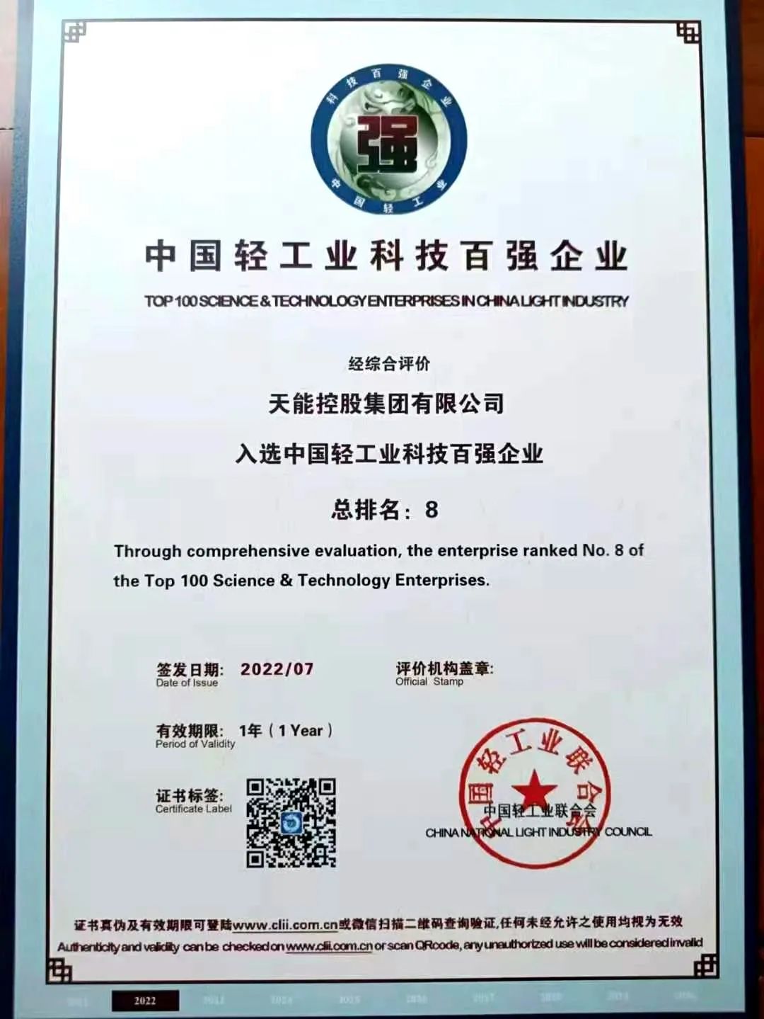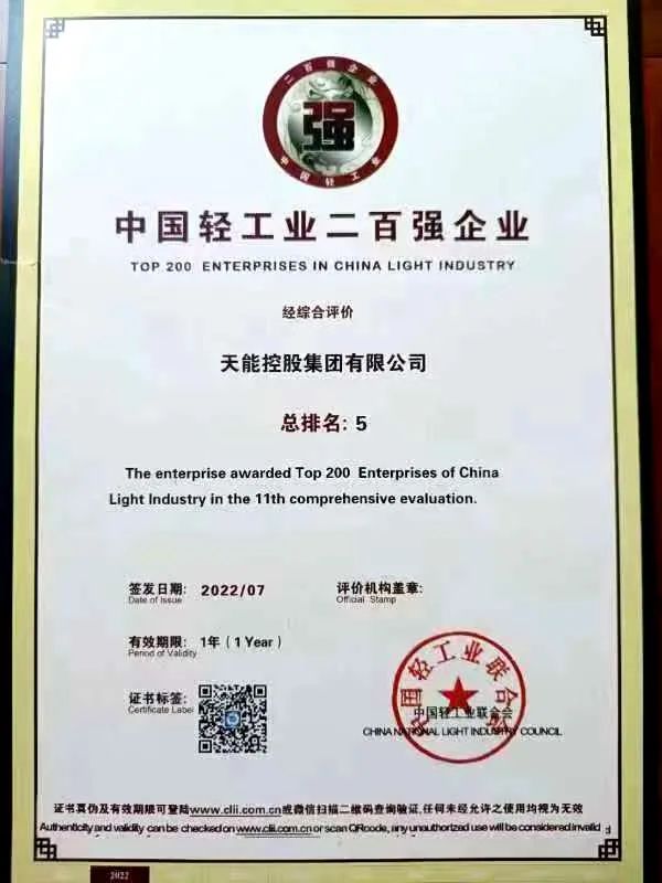 8月10日,以“贯彻新时代战略,建设轻工业强国”为主题的中国轻工业百强企业高质量发展高峰论坛在北京举行。现场2021年度各项榜单揭晓,天能排名名列前茅,分别位列中国轻工业二百强第5位,科技百强第8位。