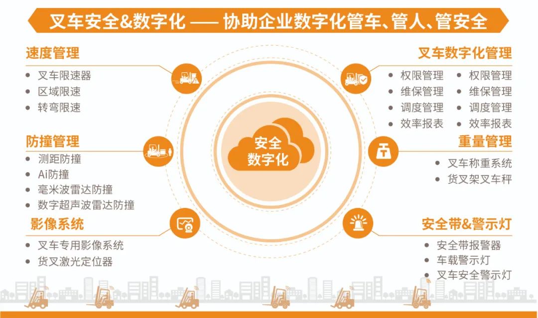 经过二十多年的发展,综合解决方案已涉及叉车速度管理、防撞管理、重量管理、影像系统及叉车数字化等诸多版块。仅防撞管理一个版块,唯创安全就有UWB测距防撞、AI影像防撞、全景影像防撞、毫米波雷达防撞、数字超声波雷达防撞及区域防撞六种适用不同场景的叉车防撞解决方案,遥遥领先市场,赢得众多客户高度赞誉!