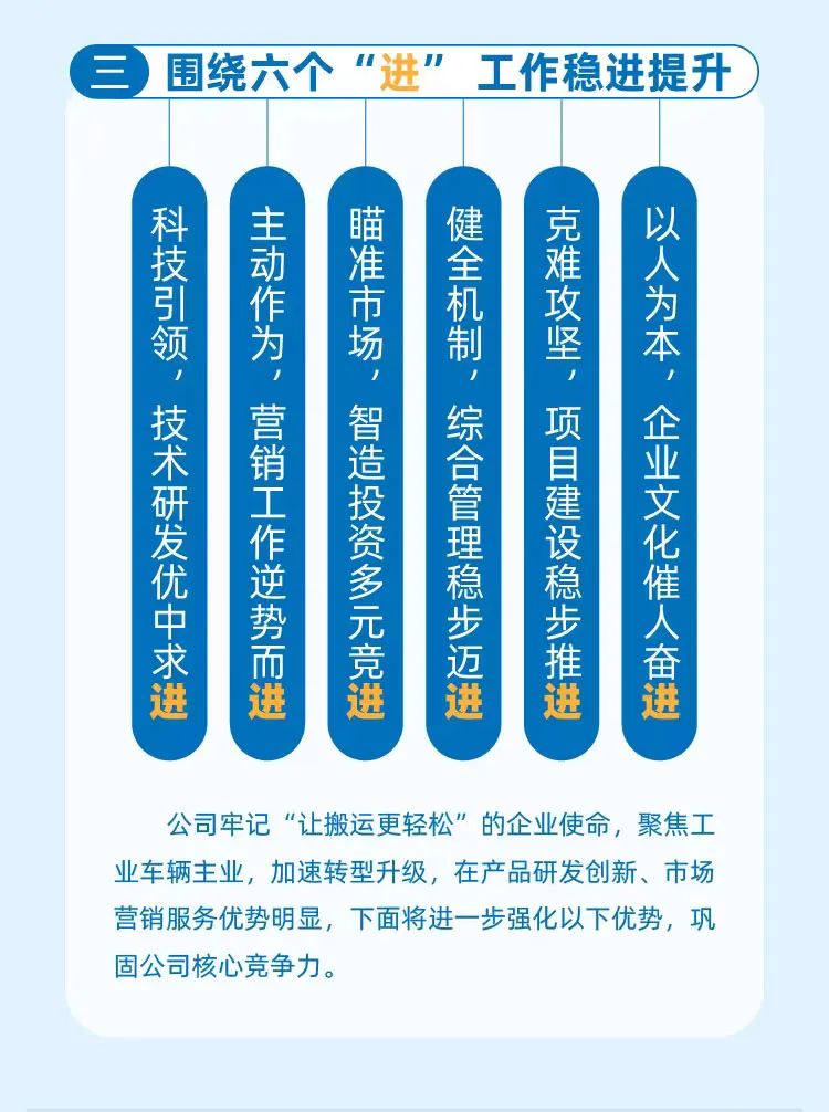 杭叉以“做世界最强叉车企业”为愿景,致力于“让搬运更轻松”,坚持“专业化生产,品牌化经营,集团化运作,国际化整合”的发展战略,实施“两头强、中间精”的发展模式,创造价值,回报社会,为客户提供最真诚的服务。