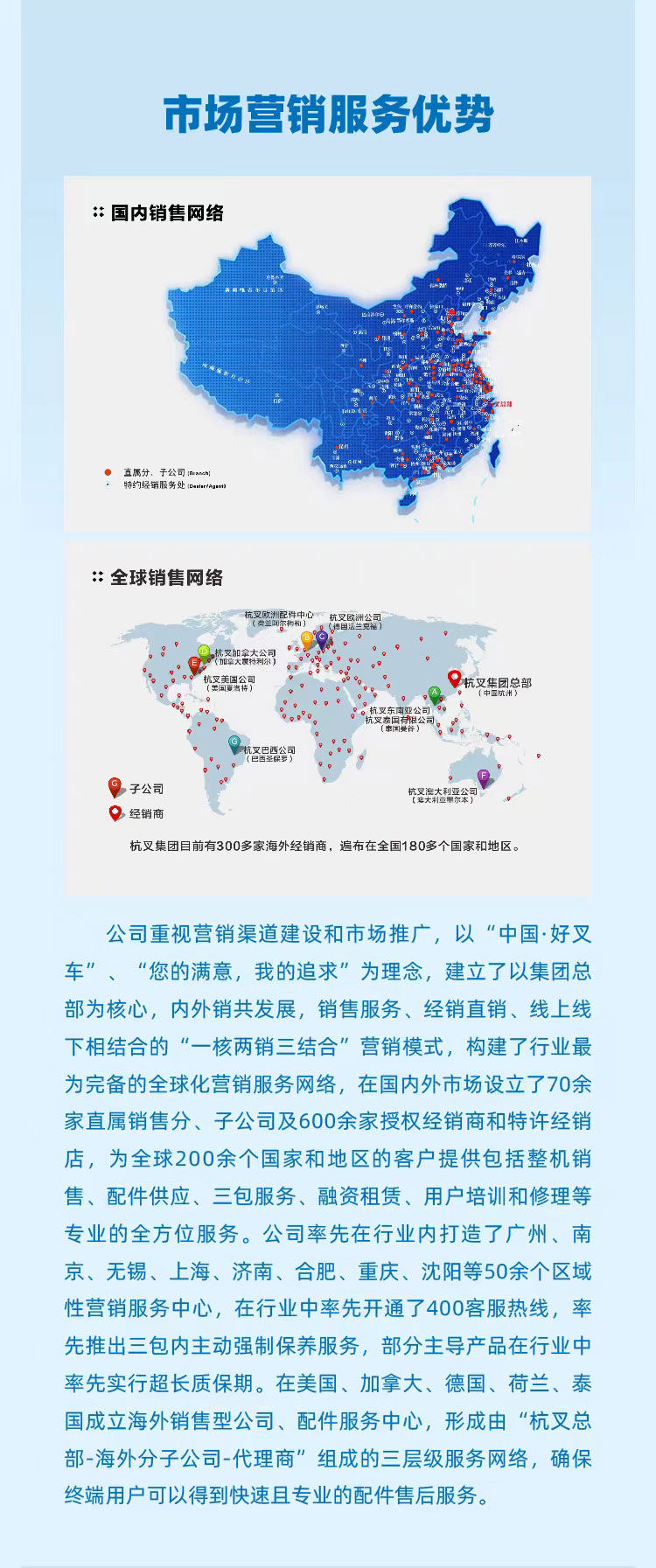 杭叉集团产品销量十多年持续位列行业前茅,连续十年保持行业出口第一。据美国《MMH现代物料搬运杂志》对全球叉车按销售额排名,杭叉集团位列世界第8位。杭叉集团的销量已占世界机动工业车辆总销量的7%以上。