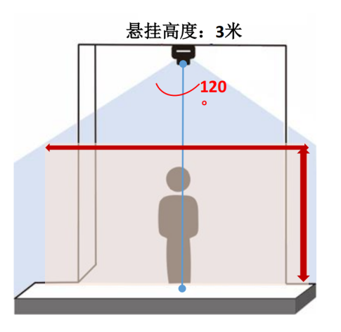 将TOF深度相机安装于闸机上方,2.5-3米的位置,检测范围可覆盖整个通行区域。在检测高度为1.8米时,可检测的水平距离达4米。