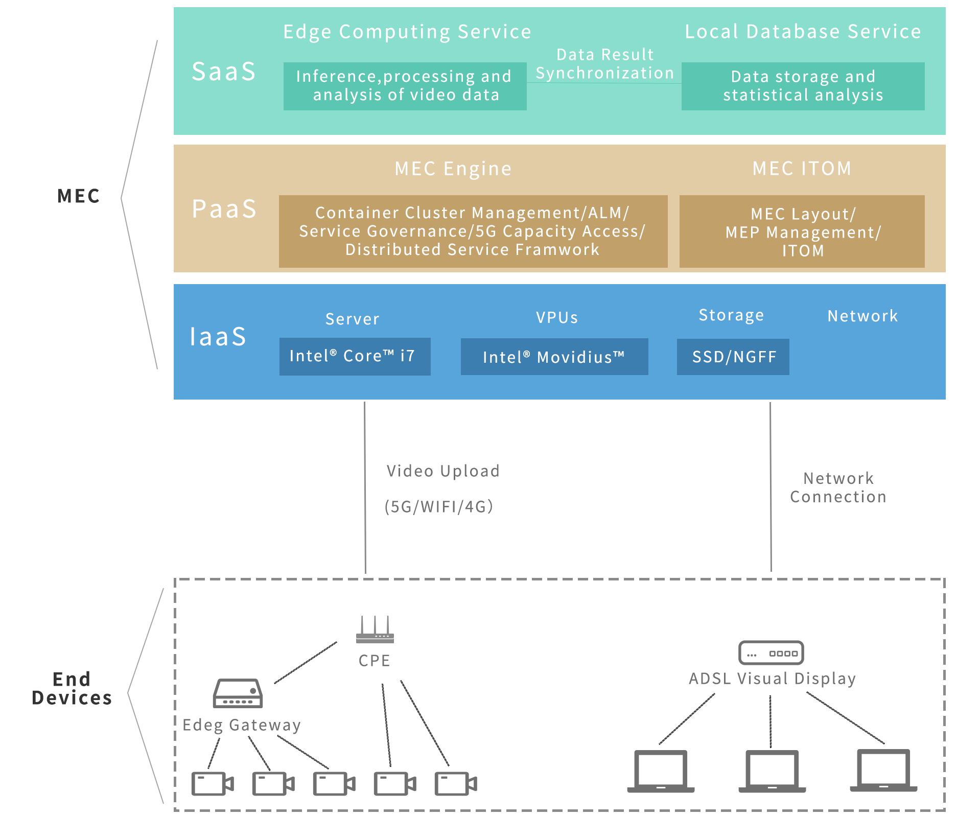 SaaS:包括边缘计算服务和本地数据库服务。边缘计算服务器主要负责模型推理。其工作流程为:摄像头采集视频数据,通过网络分发给MEC;MEC 处理视频流,通过 OpenVINO 加速的深度学习模型进行识别和推理。最后,通过本地数据库和网络服务将检测结果发送给最终用户进行审核。