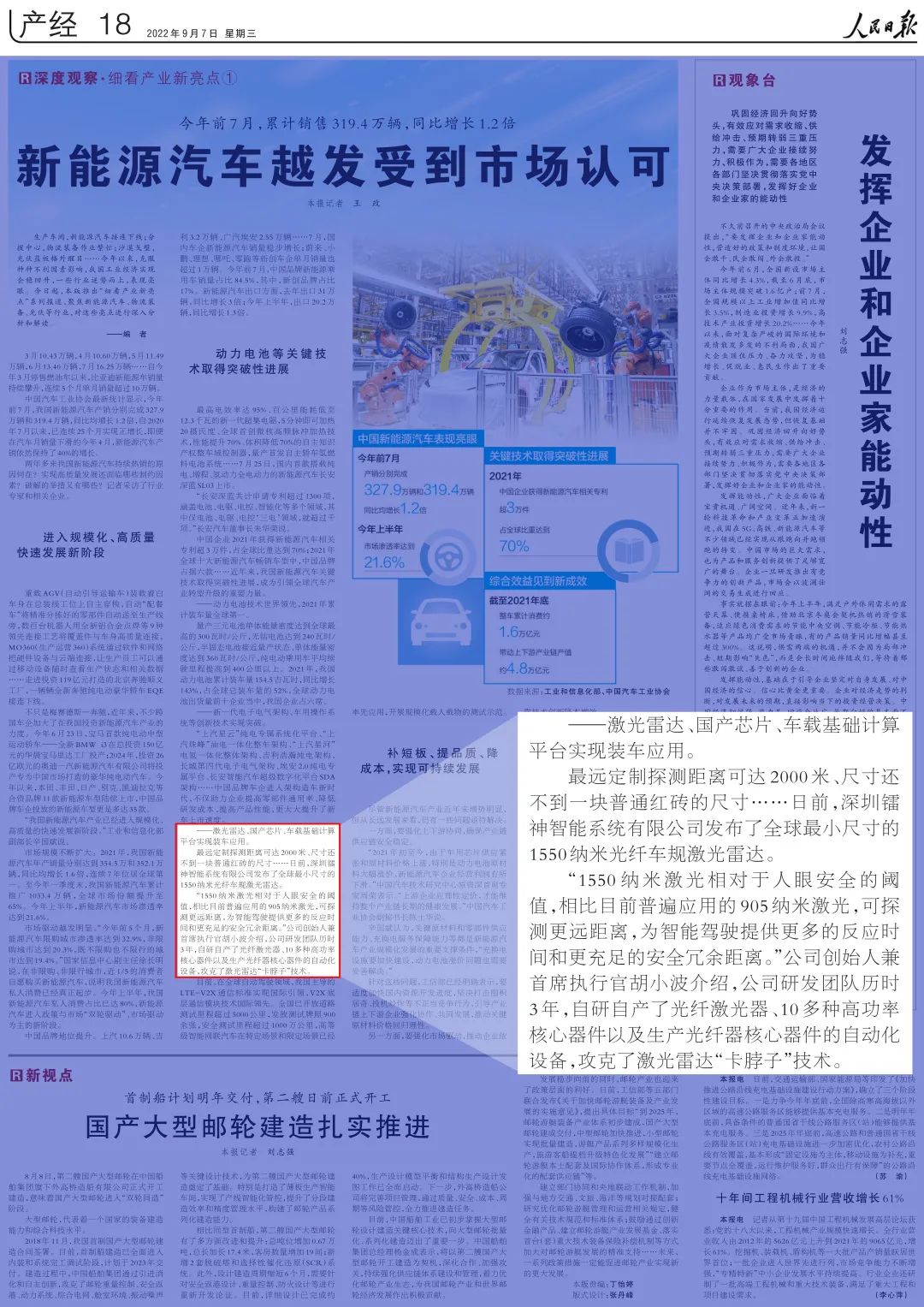 2022年9月7日,人民日报刊登了一篇名为《新能源汽车越发受到市场认可》的文章,其中介绍了镭神智能创始人胡小波带领团队攻克了我国被“卡脖子”的激光雷达技术问题。