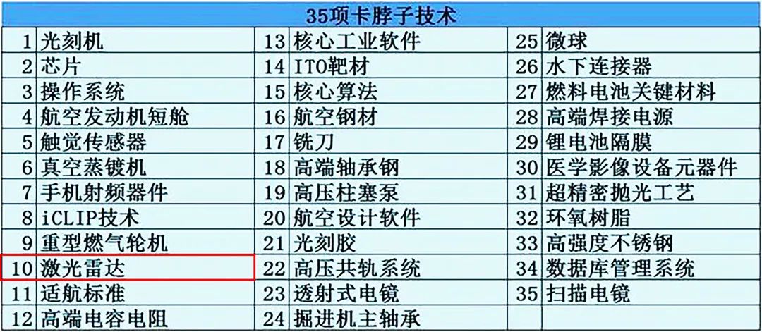 2018年《科技日报》总结了制约我国工业发展的35项“卡脖子”技术,其中第十项是激光雷达技术。
