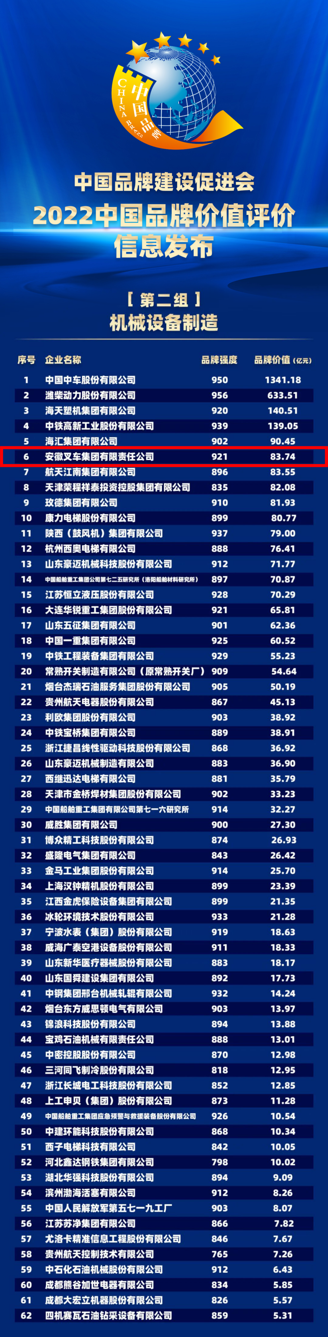 9月5日,由中国品牌建设促进会、中国资产评估协会、新华社民族品牌工程办公室等单位在京联合发布“2022中国品牌价值评价信息”。叉车集团以921的品牌强度和83.74亿元的品牌价值位列机械设备制造排行榜第6名,是工业车辆行业唯一上榜企业。