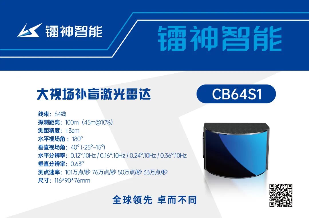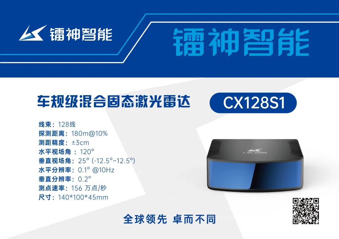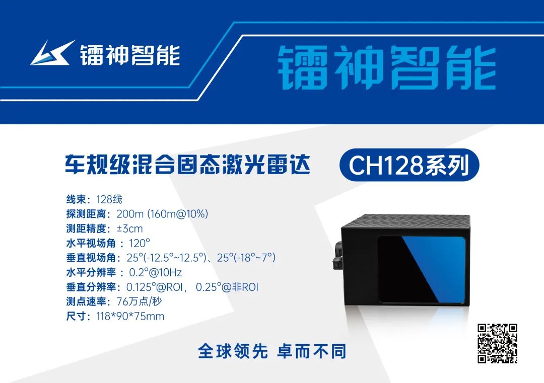镭神智能也拥有几款性能超群的905nm混合固态的激光雷达,车规混合固态激光雷达CH128X1的探测距离为160m@10%,最远可达200m,ROI内的分辨率可达0.2(H)x 0.125°(V),性能稳定可靠;大视场补盲激光雷达CB64S1具备180°x40°的超广视场角,可高效识别到近距离范围内的障碍物;车规混合固态激光雷达CX128S1(即将上市)是真128线无拼接成像,测点速率高达156万点/秒,45mm超薄尺寸,可应用于高阶自动驾驶。