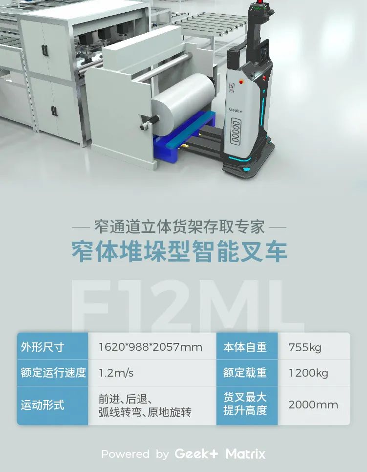 l 窄通道灵活行走一体化机身结构设计,机身更窄更轻薄,转弯半径更小,可在工厂内的狭窄通道灵活行走。