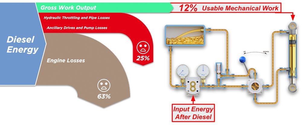 当前集中式液压系统的运行效率可能在 10% 到 40% 之间,而更复杂的电动液压执行器的运行效率在 50% 到 60% 之间。两者都必须应对各种电机损失、泵损失、小阀门和软管损失,以及由于温度和油粘度而与端口相关的损失。