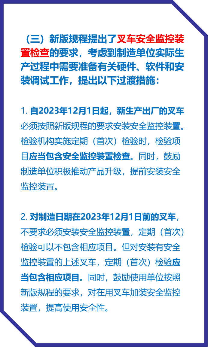 考虑到一些制造厂商需要进行硬件、软件、安装测试等一系列的准备工作,新版规程针对叉车安全提出了一些过渡措施,将新出厂叉车的一些检验项目推迟到了2023年12月1日起施行。