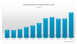 根据国际机器人联合会的一份新报告,2021年全球新安装了517,385台工业机器人,比2020年增长31%,其中美国市场的新安装量增长了14%。