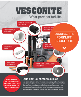 Vesconite 因其使用寿命长而享誉全球,而青铜和尼龙衬套的磨损率较高,可能会损坏配合部件。许多竞争产品需要润滑脂。由于 Vesconite 叉车部件不需要润滑,这使得它们在食品加工环境中特别受欢迎。Vesconite 的设计团队可以定制制造大多数叉车易损件,即使是已停产且难以找到零件的叉车。