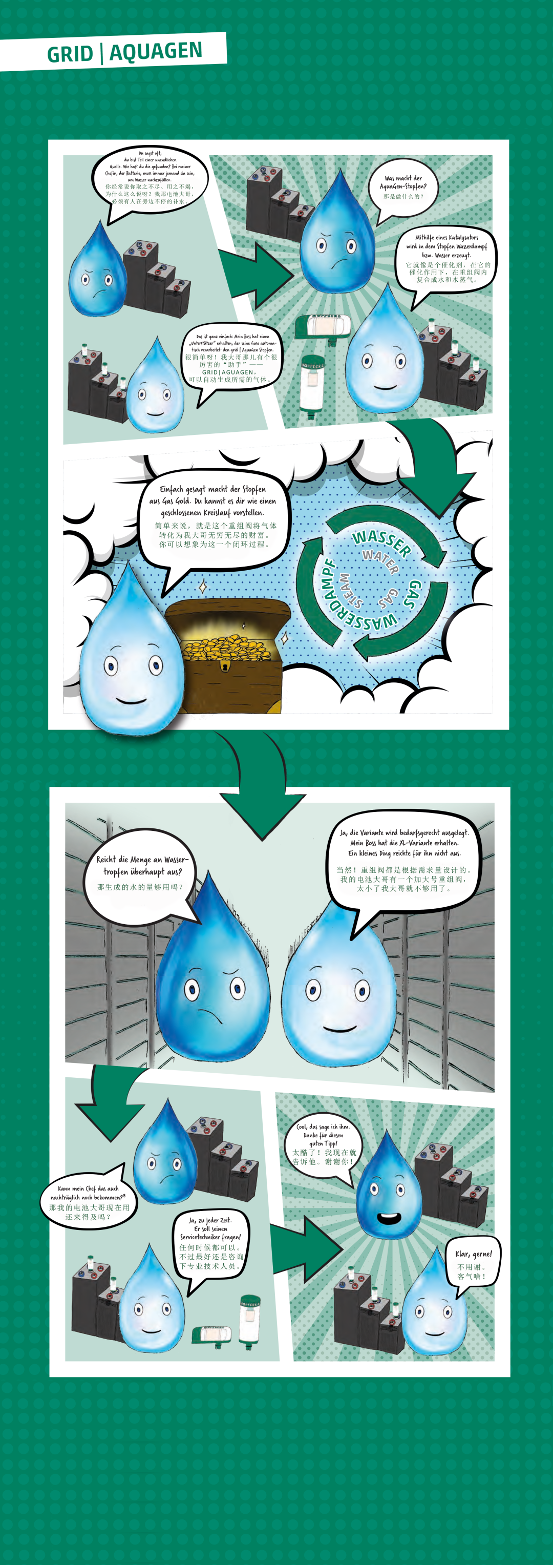 多年来,grid | AquaGen水份重组系统已在全球范围内推广使用并获得了用户的认可,作为荷贝克第四代专利的新型解决方案, grid | AquaGen水份重组系统采用的是荷贝克50年来的技术与经验。我们进一步开发久经考验的grid | AquaGen水份重组系统以便于将其应用到频繁充放电循环(峰值调节,负荷调平)的固定式蓄电池的新型应用中。