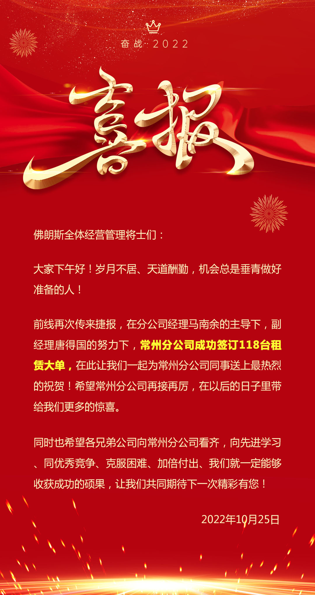 2022年,注定不平凡,面对重重困难,佛朗斯上下全体众志成城、坚韧不拔、铿锵雄心、逆水行舟,捷报不断!以不懈坚持,向无限可能;以涓涓之力,汇聚磅礴伟力,以拳拳之心抒写奋斗使命!