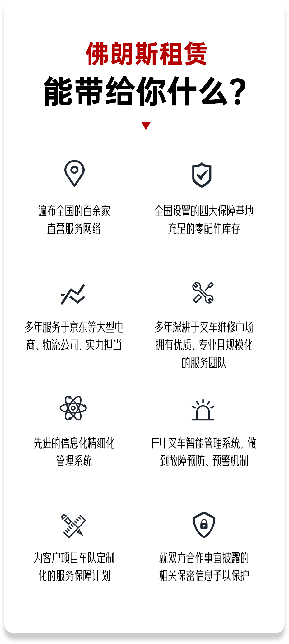 佛朗斯凭借长期深耕于场内物流设备行业所积累的丰富经验,积极培育和引导客户通过租赁服务的方式获得场内物流设备的使用权,凭借物联网创新和数字化驱动的线上智能管理平台,以及遍布全国的服务网点组成的线下营销服务网络系统,真正建立了面向企业“线上+线下”服务的商业模式,最终实现了模式创新。