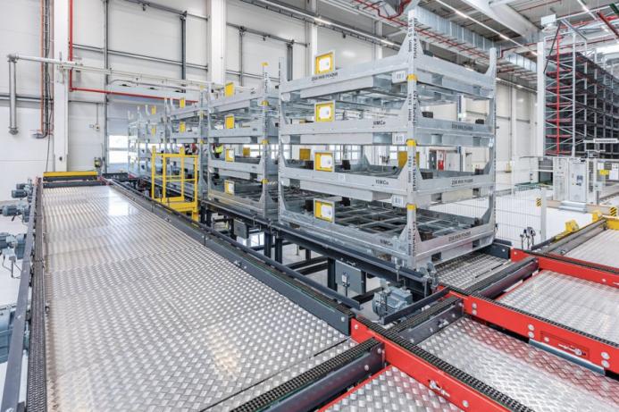 在传送带部分的末端,托盘块被自动转移到卡车装载桥。在链式输送机的帮助下,被输送的货物被顺利地移入卡车拖车,以便进一步运输。"在这里,由于变频器的作用,输送机的速度也与卡车拖车中的输送机的速度相适应。但是,不仅是以所述方式进行的卡车装载,空托盘的卸载也是以相同方式进行的。在重新装载之前,空托盘从拖车上全自动转移到平行的第二条输送线上,第二条输送线通过转角连接,沿着平行路径运行到堆放点,然后由AGV捡起钢制托盘,运回生产。