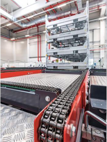 Markus Löseke说:"这条输送线由带有特别坚固的三层链条的链式输送机组成,可以轻松承受总重量达21吨的五个托盘堆的高负荷。此外,链式输送机的电机配备了变频器,可以用来单独调整钢制托盘的运输速度。"