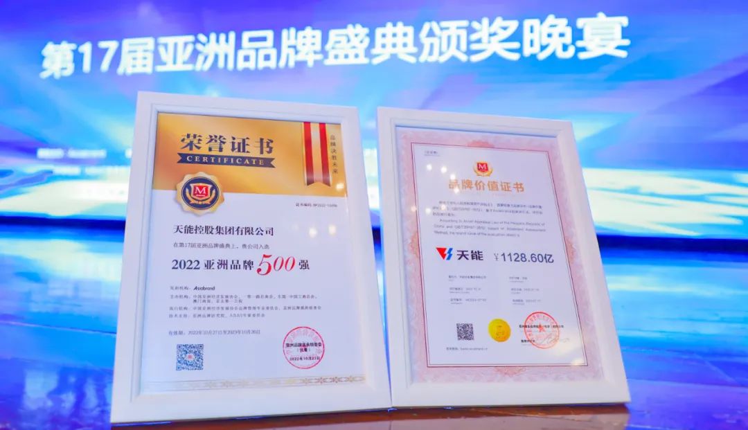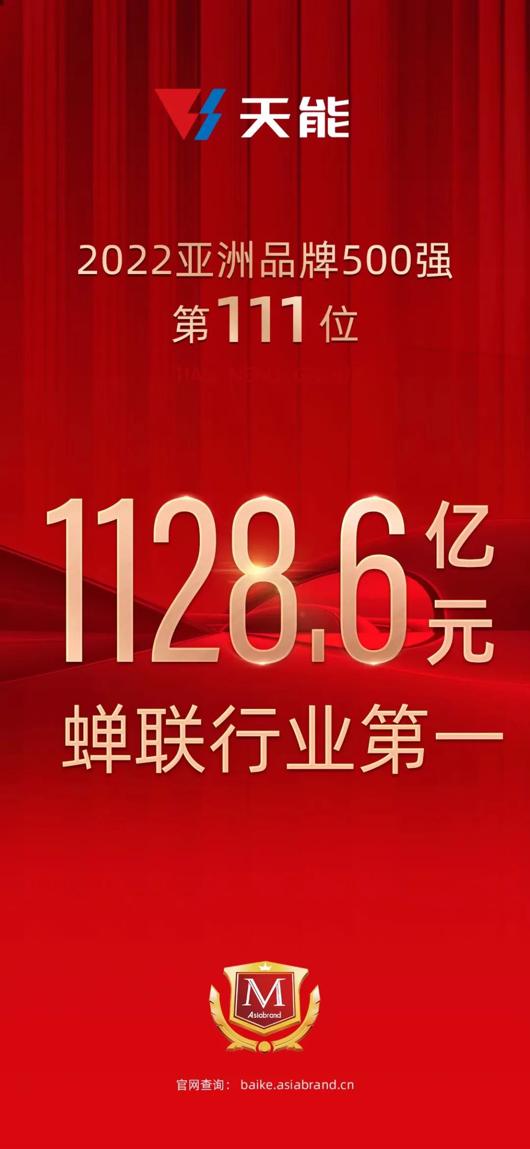 10月27日,第17届亚洲品牌盛典在海口举行,会上发布了2022亚洲品牌500强榜单,天能以1128.60亿元的品牌价值,位列第111名,蝉联行业第一。