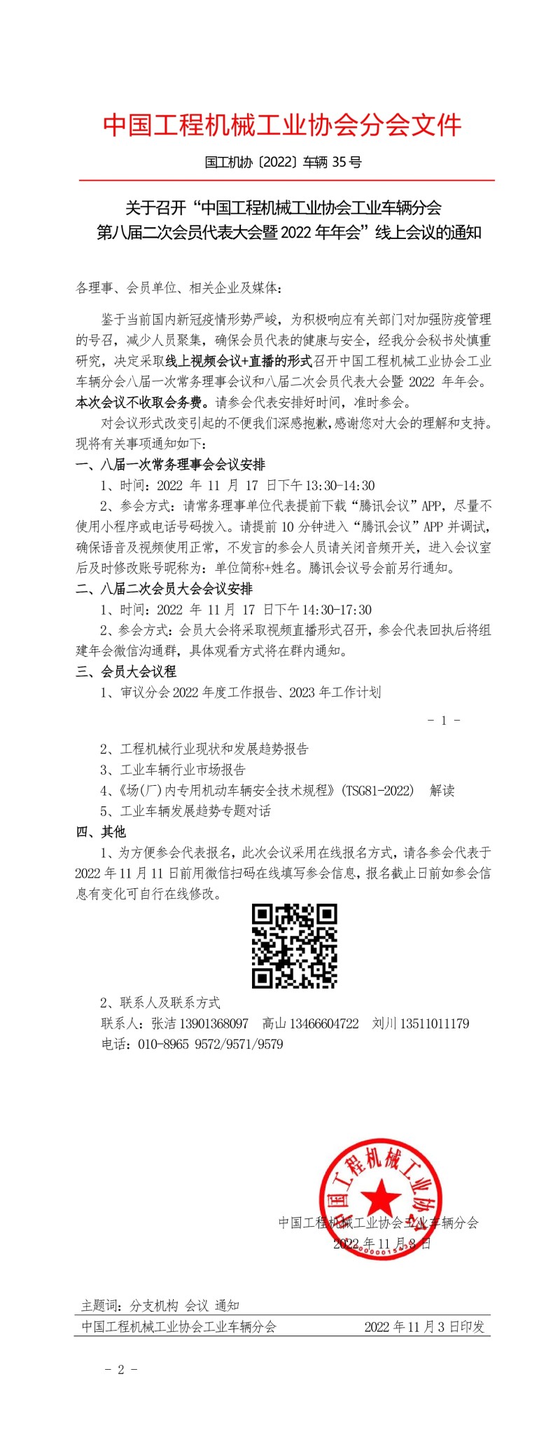 关于召开“中国工程机械工业协会工业车辆分会第八届二次会员代表大会暨2022年年会”线上会议的通知