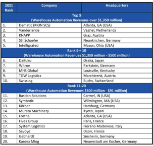 ARC根据一些资格和维度来定义仓库自动化市场,以提供一个明确的衡量标准,并有许多细分,使那些购买研究的人能够理解被衡量的东西,并轻松地推断出结果,以支持他们的战略规划需求。我们将市场定义为那些负责将系统交付给最终用户的仓库自动化供应商(以消除重复计算)。同时,仓库自动化不包括类似的系统,如机场行李处理、制造线自动化和手动驱动的叉车。这个过程涉及到对大量信息的分析,以及对众多仓库自动化供应商高管的采访;最后出版了ARC的仓库自动化和控制市场研究报告。我将很快公布2021年的基准年研究报告,并对到2026年的五年进行预测。更多信息请联系我们。 以下是根据ARC对2021年收入的估计,全球前20名仓库自动化供应商,下面是对每家公司的描述。