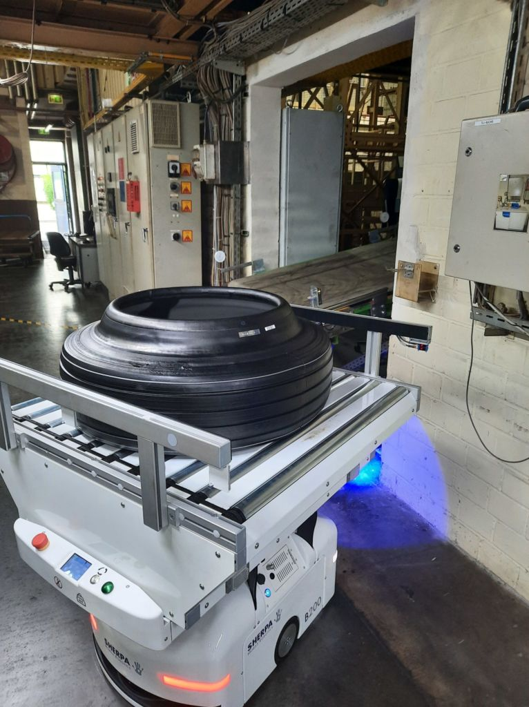 在德国Karlsruhe的米其林轮胎厂,Norcan公司集成的自主移动机器人Sherpa被用于轮胎硫化区。在那里,轮胎毛坯(绿色轮胎)由电动压力机进行硫化。为了简化轮胎坯料的运输,这一过程将被自动化。解决方案是绘制轮胎硫化部门内所有绿色轮胎的运输图,主要是从压机到高架仓库。