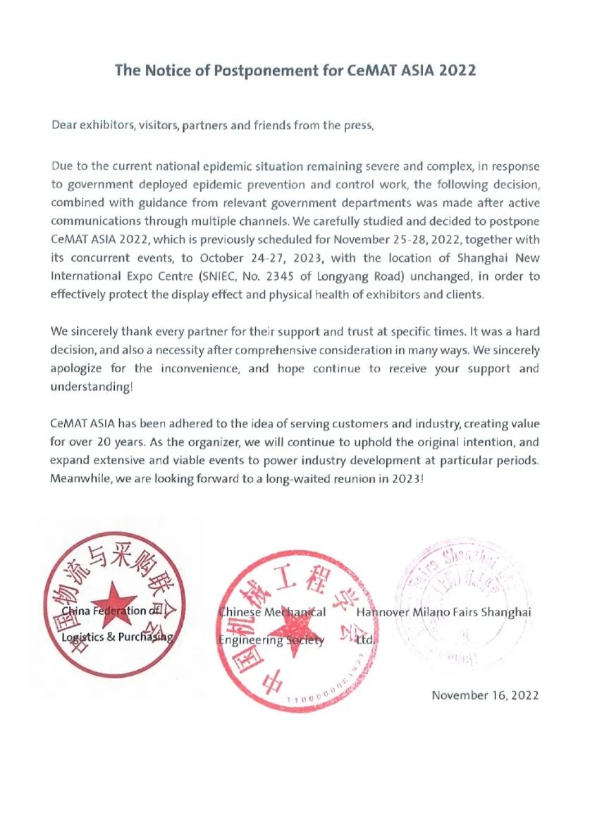 Due to the current national epidemic situation remaining severe and complex, in response to government-deployed epidemic prevention and control work, the following decision, combined with guidance from relevant government departments was made after active communications through multiple channels.We carefully studied and decided to postpone CeMAT ASIA 2022, which was previously scheduled for November 25-28, 2022, together with its concurrent events,to October 24-27, 2023, with the location of Shanghai New International Expo Centre (SNIEC, No. 2345 of Longyang Road) unchanged,in order to effectively protect the display effect and physical health of exhibitors and clients.