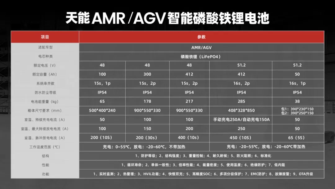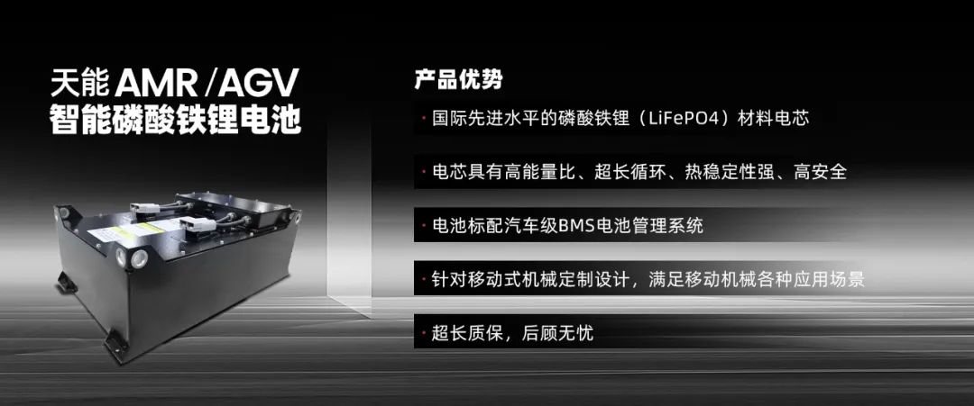 针对不同的应用场景和用户需求,天能提供全栈式绿色能源解决方案,全方位提升电池电芯和系统层级,自主研发出高能量密度、高安全性能的工业动力锂电池产品,以环保科技力量助力AMR/AGV的创新应用。