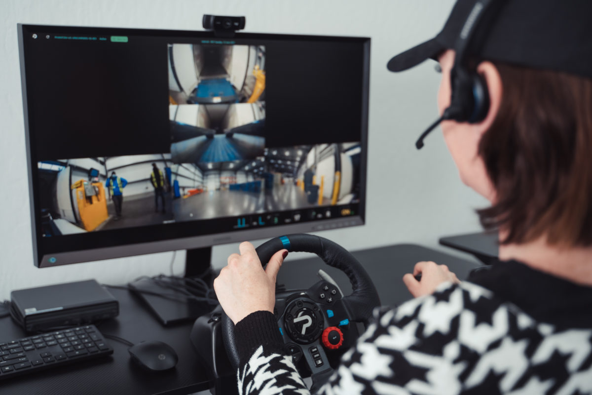 该平台几乎看起来像视频游戏马里奥卡丁车——叉车操作员坐在电脑前,使用微型方向盘和踏板远程控制机器。工作人员可以 360 度实时查看周围环境,并且可以通过双向音频与地面工作人员进行交流。