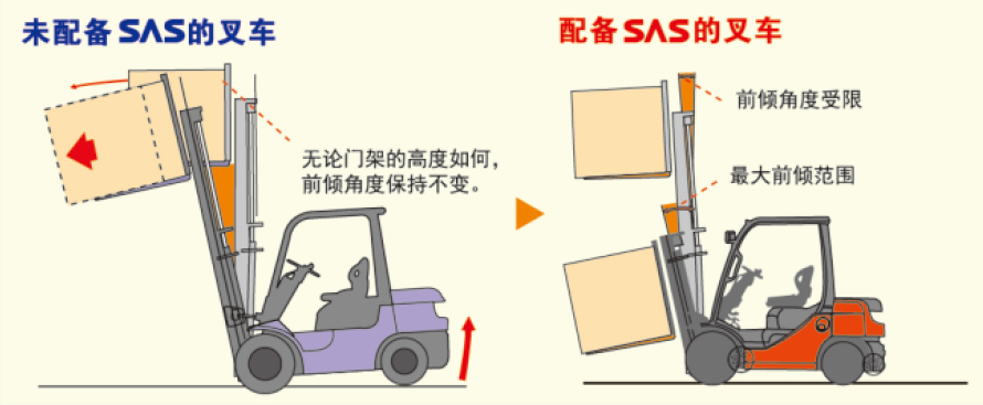 标配丰田SAS主动式稳定系统,可根据门架提升高度和负载重量,自动控制门架倾斜角度,不超过可稳定的最大角度。