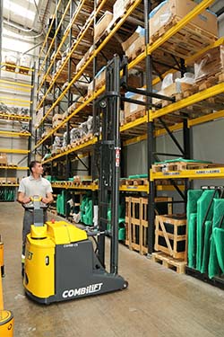 COMBILIFT 的侧置舵柄臂可将操作员从叉车后部和货架之间的“碰撞区”移开。