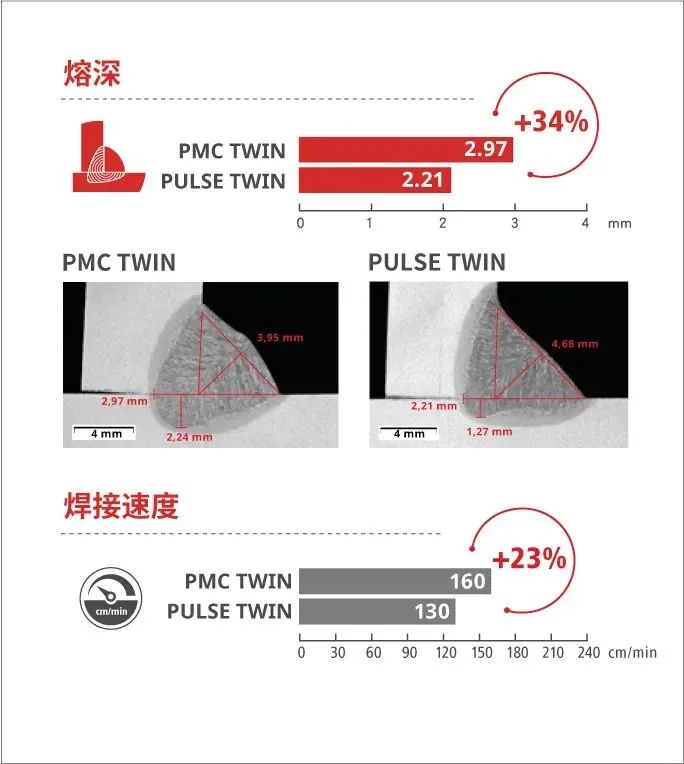 与基于 TPS 的传统 PULSE TWIN 焊接工艺相比,基于 TPS/i 的全新 PMC TWIN 焊接工艺具有诸多优点。