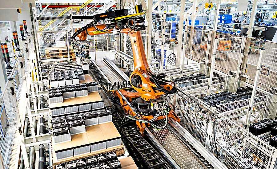 过去,电池会被存放在隔壁的仓库里,通过叉车运到生产线上,然后人工卸货。现在,电池被存放在装配线附近的托盘上。为了确保正确的电池被安装在正确的车辆上,机器人用一个特殊的摄像头扫描每个电池上的代码。然后,它把电池放在运输车上,直接运到装配线上。该机器人还堆放空托盘和运输包装,并能在需要时从仓库订购装有电池的新托盘。机器人被安装在一个长的线性轴上,使其能够从多个托盘上连续拣选电池。安全防护和传感器防止与工作人员或机器发生碰撞。