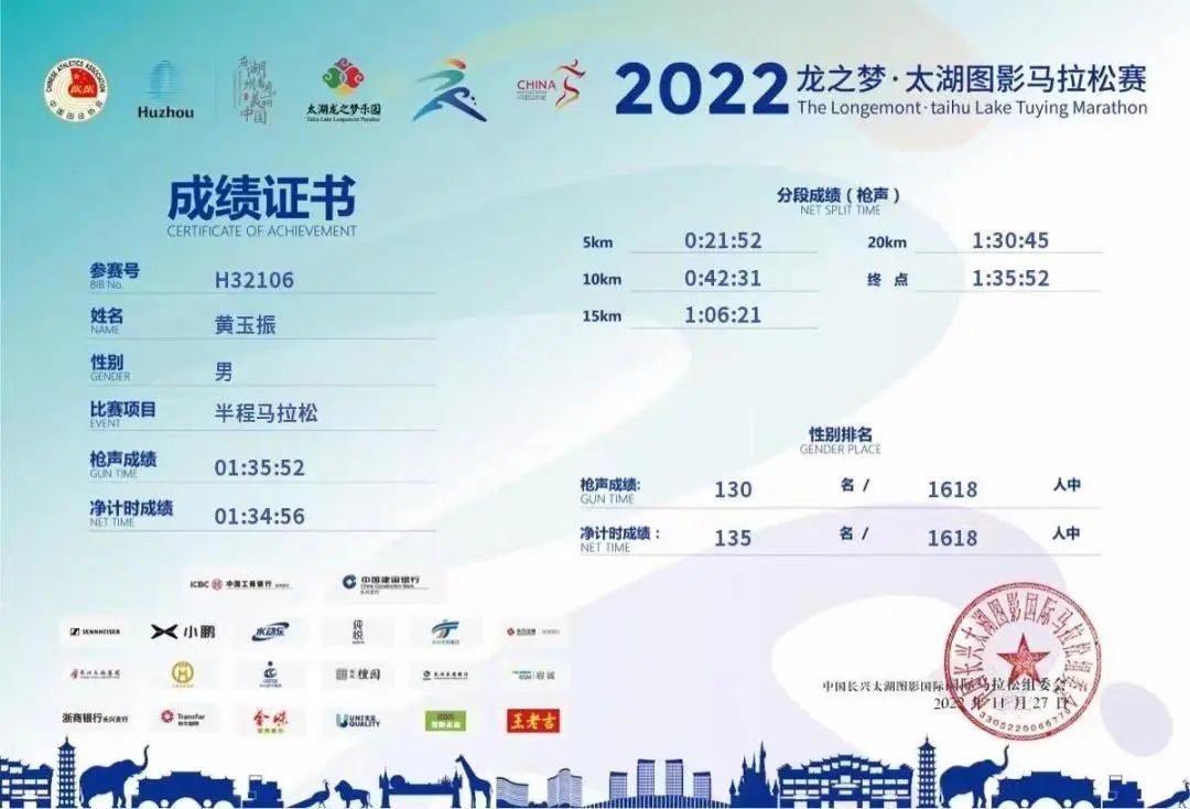 ▲上海诺力智能科技有限公司电气装配黄玉振用时1小时34分56秒获得了半程马拉松(21.0975公里)第130名