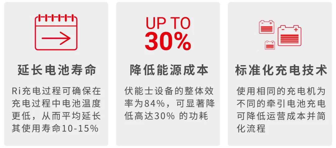 通过 Ri 充电工艺,伏能士为全球市场上的铅酸牵引电池充电提供很好技术。与其他工艺不同,该工艺不遵循固定特性曲线,而是适应每个电池的要求。这确保了很高的能源效率和较长的电池寿命。