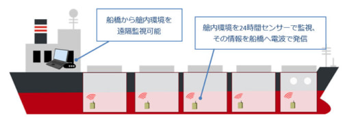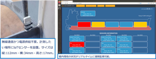 使用LPWA无线通信技术的物联网传感器可以在航行中从船桥实时远程监测运输环境,如船舱内的温度和湿度,即使在干散货船上,也很难获得来自船舱的无线通信和传感器的电源。此外,还实现了一个功能,当观察到可能对货物造成损害的数据时,用警报等通知船员。