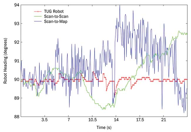 该图表说明了扩展卡尔曼滤波器的结果。显示的是来自 Aethon 的 TUG 自主移动机器人沿着制造工厂的过道行驶的结果。过道呈90度角对齐。扫描到扫描算法(绿色)虽然相对平滑,但由于累积误差可能会漂移(如图的后半部分所示)。扫描到地图算法(蓝色)给出了均值可能跳跃的噪声数据。这些变化是由于材料移动导致地图与当前环境不匹配造成的。红线是通过使用扩展卡尔曼滤波器结合所有定位技术计算出的 TUG 位置的估计值。跳跃是由使用绝对定位算法引起的。由 Aethon 提供。