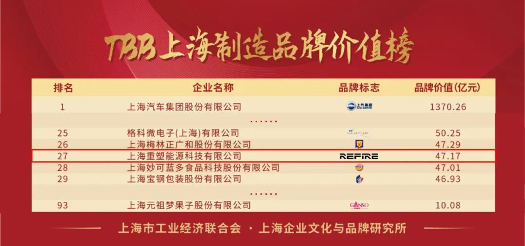 12月27日,由上海市工业经济联合会、上海市经济团体联合会协同上海企业文化与品牌研究所推出的2022年上海品牌价值榜通过线上形式发布,重塑集团凭借在研发制造、产品口碑、市场占有率以及全球燃料电池行业影响力等维度的突出表现,荣登TBB(THE BEST BRAND)上海制造业品牌价值榜,成为该榜单TOP 50之一。