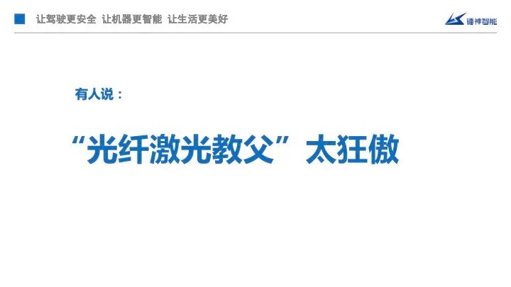 我是在2015年年初出了车祸,差点没命了才进入了激光雷达这个赛道。我原来是国内光纤激光行业老大,现在活得也比较憋屈,在汽车行业,我是一名新兵,所以我们一直是夹着尾巴做人,但是该做的事儿还是要做。但是我这个“光纤激光教父”不可能改了,任何人也不要劝我改,这个“教父”每年帮我省很多广告费,你们想想,我们公司一个博士生没有,但是有“教父”,光纤激光雷达这个领域,一个“教父”顶一百个博士,大概是这个概念。