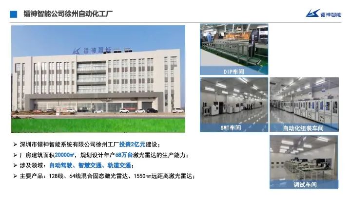 这个是我们的厂房,以及自动化产线,规划年产68万台的车规激光雷达。镭神的雷达不光用在汽车里面,整个汽车相关的,公路的智慧交通我们也设计,我们其实还做了国内最多的车路协同的落地的解决方案应用案例,还有轨道、水运、航空,大基建大交通,服务机器人,工业自动化,测绘、安防还有一些特殊应用。
