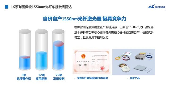 镭神智能同时掌握了TOF时间飞行法、相位法、三角法和调频连续波等四种测量原理,打造了齐全的激光雷达产品矩阵,包括1550nm光纤激光雷达、905nm混合固态激光雷达、多线机械式激光雷达、单线机械式激光雷达、Flash激光雷达、FMCW激光雷达并深度集成垂直产业链资源,自研自产激光雷达收发集成电路芯片、1550nm光纤激光器及十多种高功率核心器件等关键核心器件,并掌握半导体封装工艺,建立了激光雷达自动化及半自动化产线,彻底攻克我国被“卡脖子”的35项关键技术之一的激光雷达技术问题,并获《人民日报》报道。