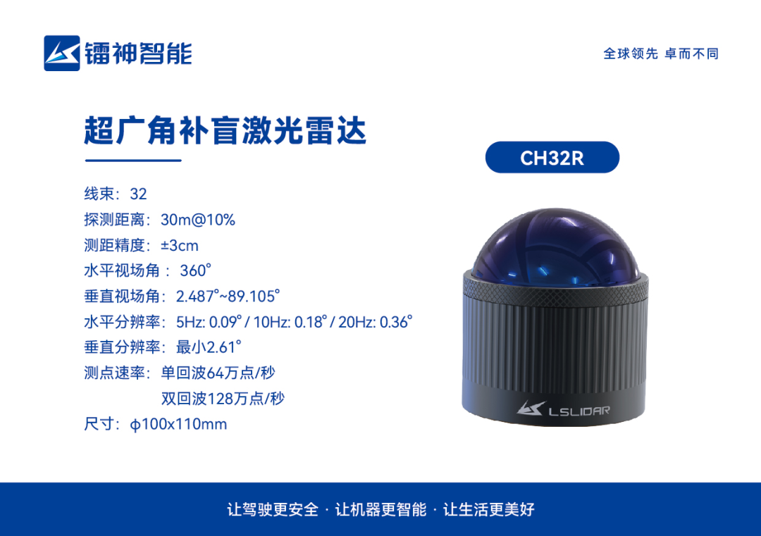 另外,现场展示了镭神智能另一重磅新品——CH32R系列超广角补盲激光雷达。CR系列激光雷达以密集的32线束激光实现360°三维高速扫描,垂直视场角可达90°,探测距离30m,测量精度精确至±3cm,垂直角分辨率最小为2.61°,广泛应用于无人驾驶、汽车ADAS、智慧交通、服务机器人、物流、测绘、 安防、港口、工业等领域。