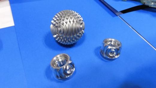 在这样的情况下,有意见认为树脂齿轮的强度存在顾虑,所以这次我们也首次展出了铝制球齿轮。它是使用可以加工复杂形状的机床的 5 轴加工中心切割的。不仅是球形齿轮,而且接收它的特殊形状的齿轮也是由铝制成的。