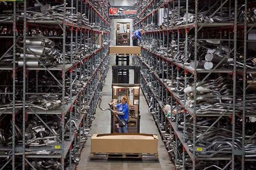 在某些应用中,定制化是绝对必要的。雷蒙德公司技术解决方案和营销高级经理Susan Comfort说,在冷藏设施中,防止防护罩冻结的网状桅杆防护装置和在寒冷条件下性能良好的电池至关重要。帮助操作员更容易(和安全地)处理沉重、庞大的货物的改装,在家具分销和汽车零部件等行业是必须的。她举例说,有一个客户特别订购了一辆有四个货叉的叉车,以处理宽而重的消声器(见照片)。