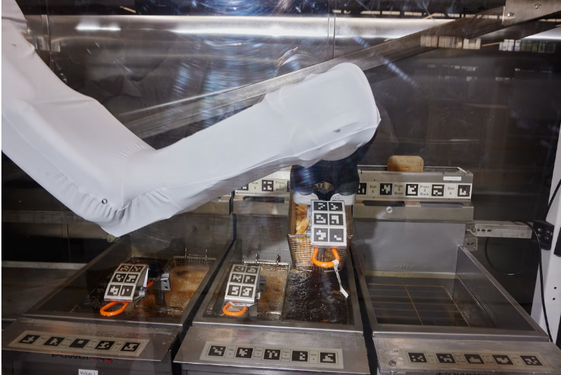 美国加利福尼亚州帕萨迪纳市 Miso Robotics 办公室的机器人正在制作炸薯条